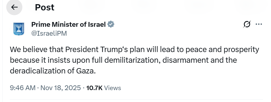 At no point did she note that Prime Minister Netanyahu applauded the Security Council’s vote to adopt the resolution. As the Associated Press earlier reported in the aforementioned article (though the quote was sliced out of the later version):Netanyahu on Tuesday applauded the U.N. approval of Trump’s plan for postwar Gaza.“We believe that President Trump‘s plan will lead to peace and prosperity because it insists upon full demilitarization, disarmament and the deradicalization of Gaza,” Netanyahu’s office wrote on X.