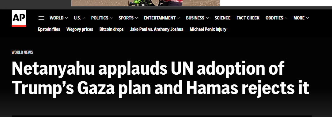 In a flurry of news coverage about United Nations Security Council Resolution 2803 to adopt President Trump’s plan for the Gaza Strip, a fleeting moment of rare clarity appeared in an Associated Press headline: “Netanyahu applauds UN adoption of Trump’s Gaza plan and Hamas rejects it.”