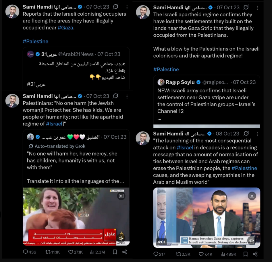 Already on Oct. 7, Hamdi couldn’t contain his joy. He excitedly posted on X (formerly Twitter): “Reports that the Israeli colonising occupiers are fleeing the areas they have illegally occupied near #Gaza.” About the kidnapping of Shiri Bibas and her two young sons, Ariel (4) and infant Kfir, he propagandized that the terrorists who came to kidnap them called out: “No one harm [the Jewish woman!] Protect her. She has kids. We are people of humanity; not like [the apartheid regime of #israel.” On that eventful day, he also gloated about the Palestinian terror attacks carried out within internationally-recognized Israeli territory: