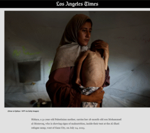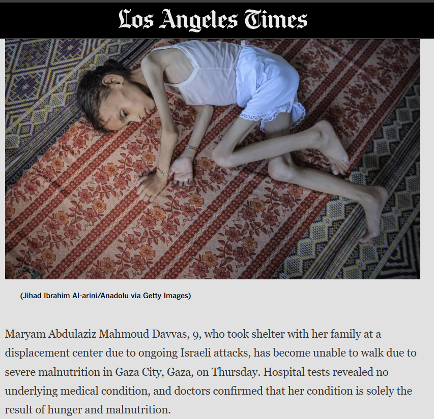By erasing the underlying medical disorders of these extreme cases, the Times depicts these horribly suffering children as representative of the condition of all children in the Gaza Strip. Thus, the photo essay opens: “These images are part of a series highlighting the suffering of children in Gaza, where a humanitarian disaster is escalating and civilians are starving.”