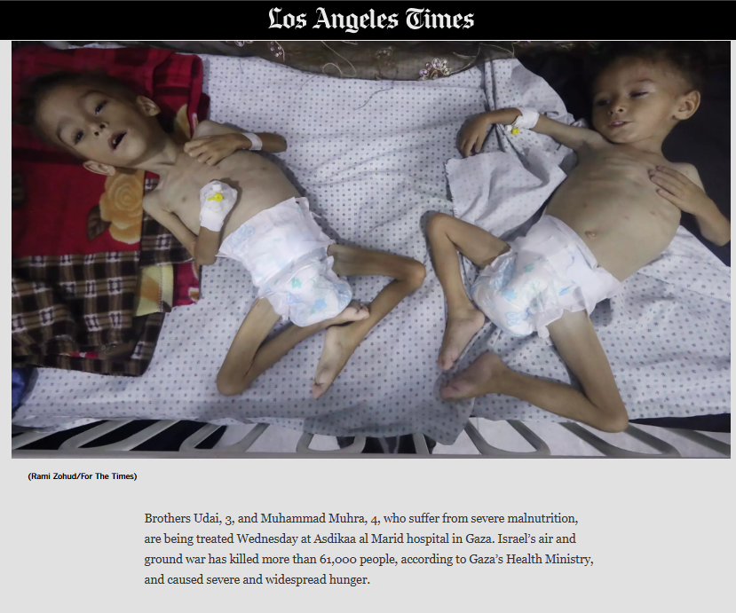 Brothers Udai, 3, and Muhammad Muhra, 4, who suffer from severe malnutrition, are being treated Wednesday at Askidaa al Marid hospital in Gaza. Israel’s air and ground war has killed more than 61,000 people, according to Gaza’s Health Ministry, and caused severe and widespread hunger.