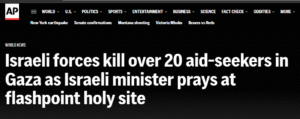 Separately, in its communication with editors, CAMERA noted that the digital version of the headline for this article stated as fact, and without attribution, that Israeli forces are responsible for shooting dead more than 20 aid seekers (“Israeli forces kill over 20 aid-seekers in Gaza as Israeli minister prays at flashpoint holy site“). Again, while the original print headline (available on Lexis-Nexis) attributed the claim that the IDF killed over 20 aid-seekers to witnesses and [Hamas] health officials, AP’s website upgraded the unverified claim to fact.