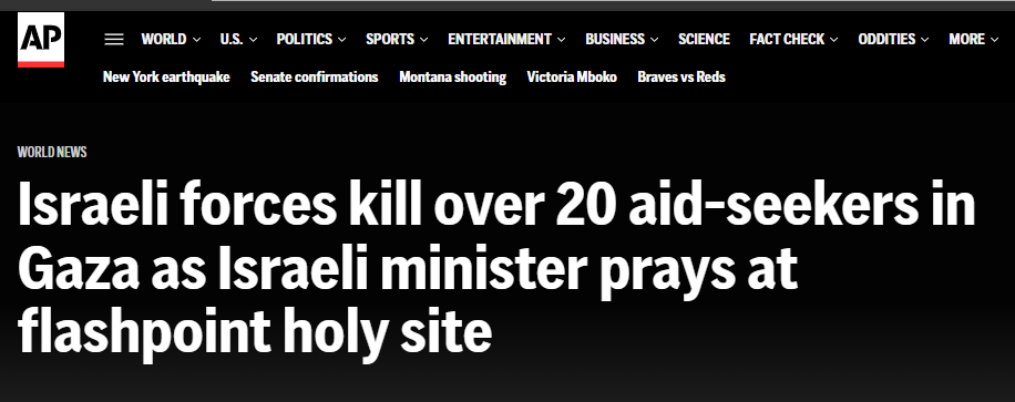 From Jerusalem to the Gaza Strip, the Associated Press yesterday implemented multiple substantive improvements on a story originally entitled (“Israeli forces kill over 20 aid seekers in Gaza, witnesses and health officials say,” retrieved yesterday from Lexis-Nexis news database). An updated digital version of the same Aug. 3 is available here, and was originally headlined (“Israeli forces kill over 20 aid-seekers in Gaza as Israeli minister prays at flashpoint holy site,” screenshot follows).