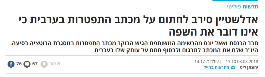 Adelstein’s [sic] office explained that the speaker would not sign a letter which he cannot read, and demanded it be resubmitted in Hebrew. Adelstein had the letter translated by Knesset staff and signed onto the Hebrew version.
