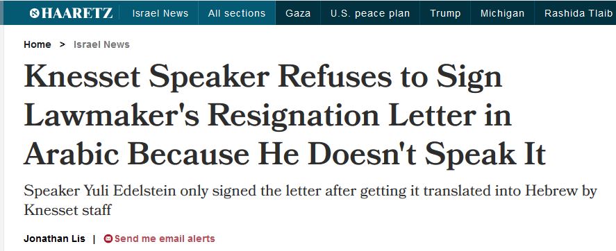 Editors at Haaretz‘s English edition agreed that the English headline required clarification, and commendably amended the headline to accurately state: “Knesset Speaker Refuses to Sign Lawmaker’s Resignation Letter in Arabic Because He Doesn’t Speak It.” Haaretz also amended the subheadline which had originally stated: “Speaker Yuli Edelstein only accepted the resignation after the letter was translated to Hebrew.” The amended subheadline replaces the passive voice with active voice, as it was Edelstein himself who sent the letter for translation, so that he could understand it and subsequently sign.