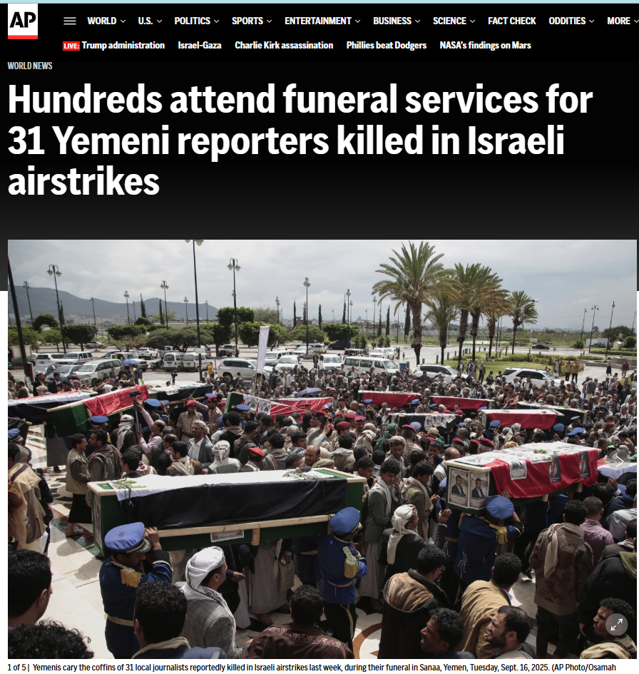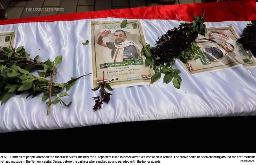 CAMERA yesterday asked the AP whether the news agency has been able to verify that the “journalists” killed are bona fide journalists as opposed to employees of the public relations department for the Houthi regime, whose slogan is “Allah is the Greatest; Death to America; Death to Israel; A Curse upon the Jews; Victory to Islam”?