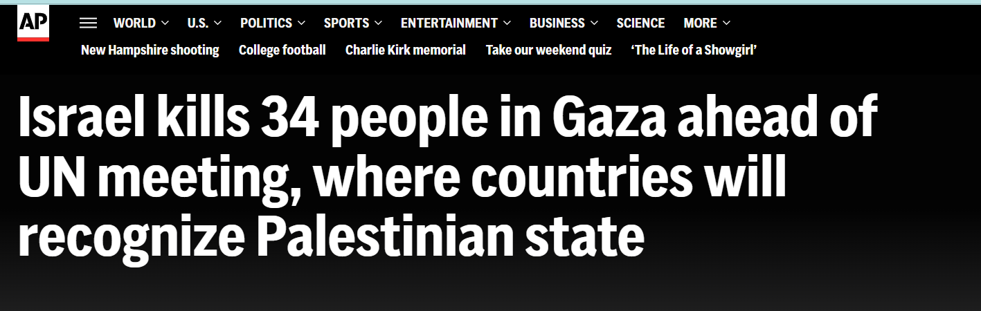 Today’s headline (screenshot at left) originally stated without qualification: “Israel kills 34 people in Gaza ahead of UN meeting, where countries will recognize Palestinian state.”