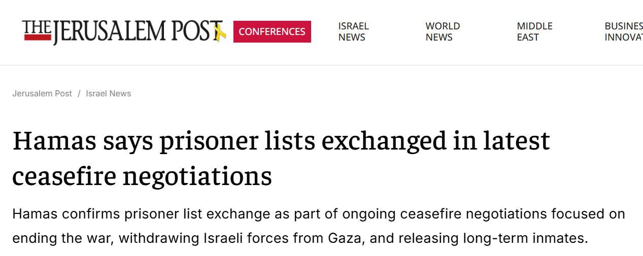 Hamas confirmed on Wednesday that prisoner lists were exchanged as part of ongoing indirect talks aimed at reaching a ceasefire agreement.