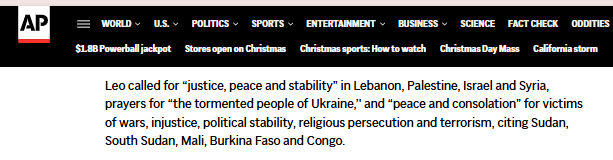 Leo called for “justice, peace and stability” in Lebanon, Palestine, Israel and Syria, prayers for ‘the tormented people of Ukraine,’ and ‘peace and consolation’ for victims of wars, injustice, political stability, religious persecution and terrorism, citing Sudan, South Sudan, Mali, Burkina Faso and Congo. [Emphasis added.]