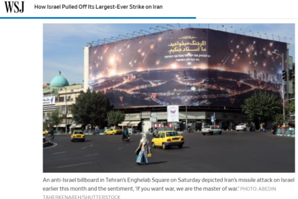 UPDATE: The Wall Street Journal corrects an Oct. 26 photo caption which had erased the Hebrew message on a Tehran billboard stating: "Israel should be wiped off the face of the earth and that is just the beginning of the story."