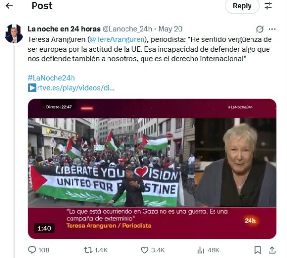 Fortes went further, publishing a thread justifying RTVE’s stance and directly accusing Israel of genocide, further erasing the line between journalist and political activist. His show, “The Night in 24h,” has repeatedly featured guests who demonize Israel, such as Teresa Aranguren, Carlos Hipólito and Javier Fesser, with no representation from opposing viewpoints.
