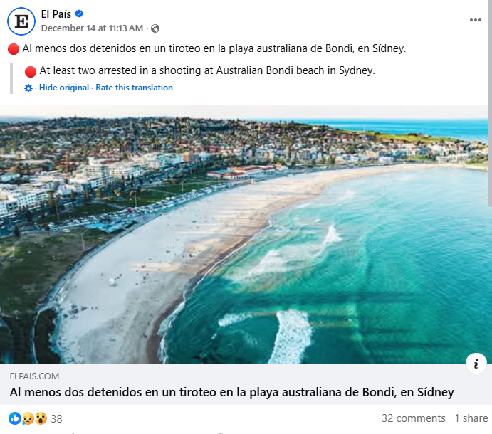 Spain’s leading newspaper, El País, for instance, initially published a cautious headline: “At least two people detained after a shooting on Australia’s Bondi Beach in Sydney.”