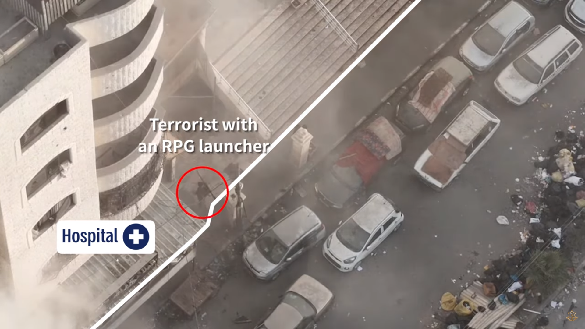 Drone footage showing a Palestinian terrorist with a rocket propelled grenade launcher using a hospital as cover.